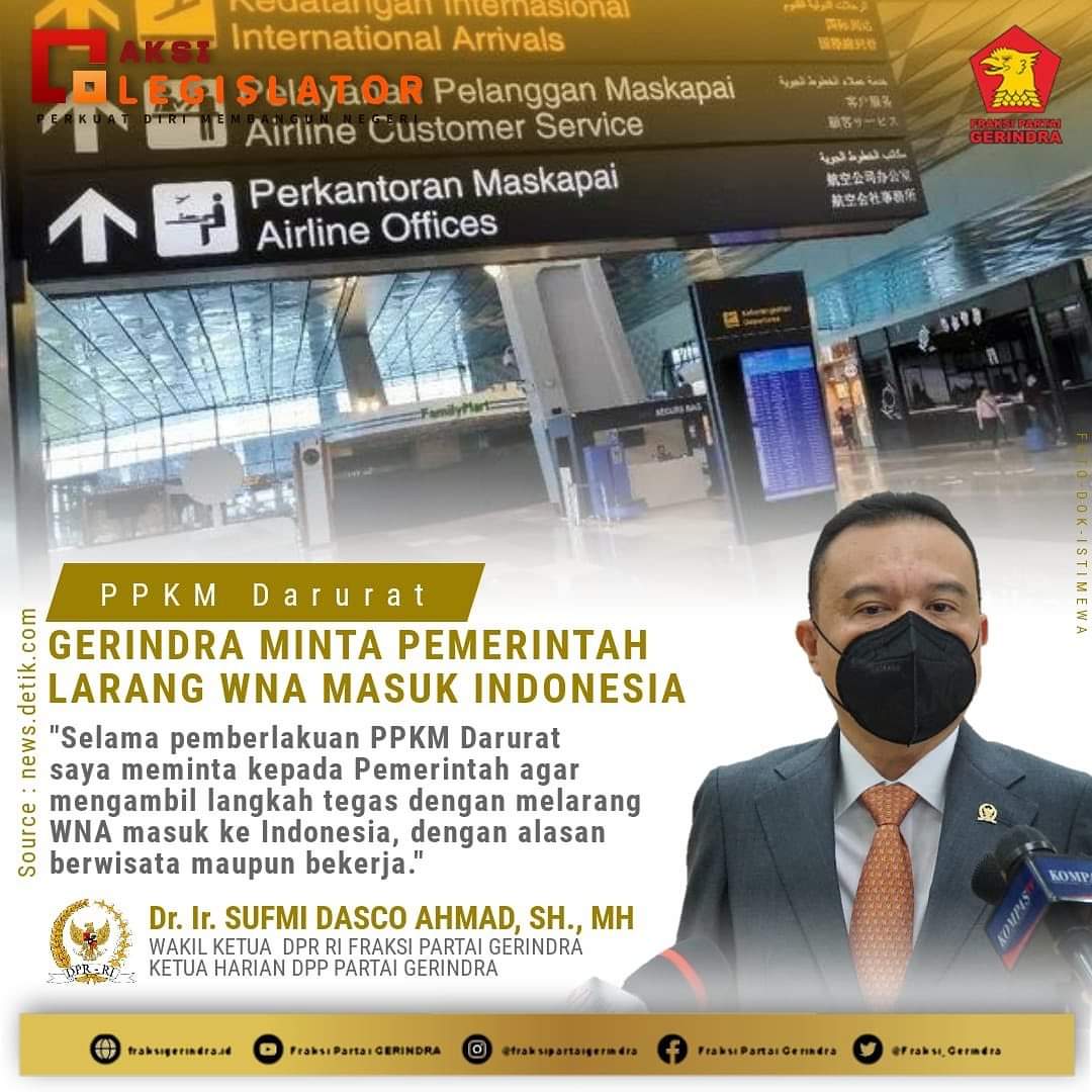 “Saya selaku Sekjen PP GPI, angkat topi dan beri apresiasi atas sikap tegas. Ketua Harian DPP Partai Gerindra Sufmi Dasco Ahmad, keberanian dan sikap tegasnya meminta Pemerintah menutup pintu kepada WNA masuk ke Indonesia patut didukung,” tegas Sekjen PP GPI. Saat dikonfirmasi melalui telpon, Senin (05/7/2021).
