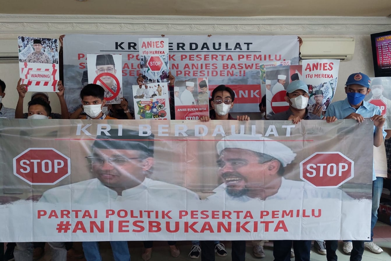 “Rakyat Indonesia, mari berdaulat dan bersatu tolak Anies Baswedan, dan mari kita lawan kelompok radikan,” ucap Izak selaku koordinator KRI.